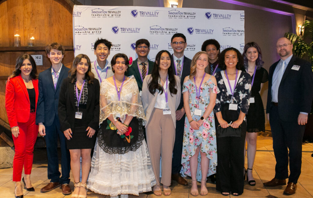 Photo by Lisa Chow Photography. Pictured from left NBC Bay Area Jessica Aguirre, Pleasanton USD winner Logan Dickey, Dublin USD winner Ankita Khatri, San Ramon Valley USD winner Gavin Ginn, TVROP winner Evelyn Arroyo, Digital Dreamer from San Ramon Valley USD Gatik Trivedi, LVUSD winner Dorothee Catipon, Las Positas College winner Kyle Johnson, LVJUSD winners Caylie Natsch, Calvin Shawler, Caydence Johnson, Naomi Zika, Rick Shumway ITV Chair and President and CEO, Stanford Health Care – ValleyCare